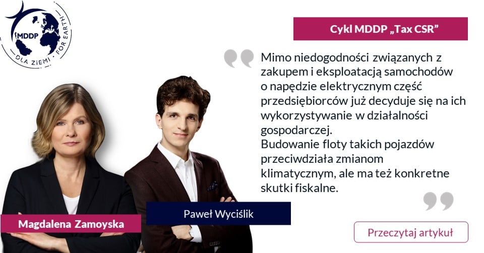 Dziś w kolejnym odcinku autorskiego cyklu ekspertów MDDP na łamach Dziennika Gazety Prawnej dotyczącego skutków podatkowych działań z zakresu CSR, analizujemy, czy firmy mogą liczyć na zachęty finansowe, w tym preferencje wynikające z prawa podatkowego, które mogłyby mieć wpływ na podjęcie decyzji o odejściu od pojazdów spalinowych, głównie aut osobowych, w działalności gospodarczej.