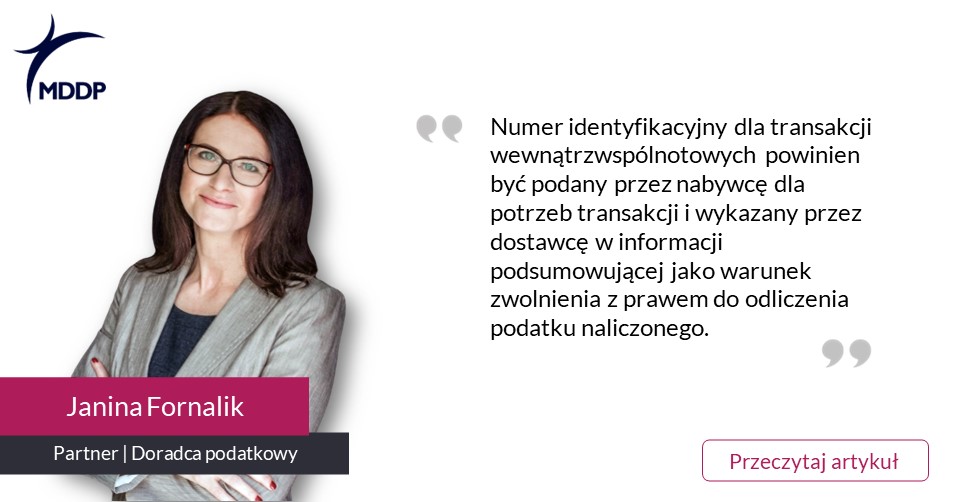 Janina Fornalik, doradca podatkowy i partner w MDDP, zauważa: „Numer ten powinien być podany przez nabywcę dla potrzeb transakcji i wykazany przez dostawcę w informacji podsumowującej jako warunek zwolnienia z prawem do odliczenia podatku naliczonego”. Odpowiednikiem zwolnienia z prawem do odliczenia jest zerowa stawka VAT.
