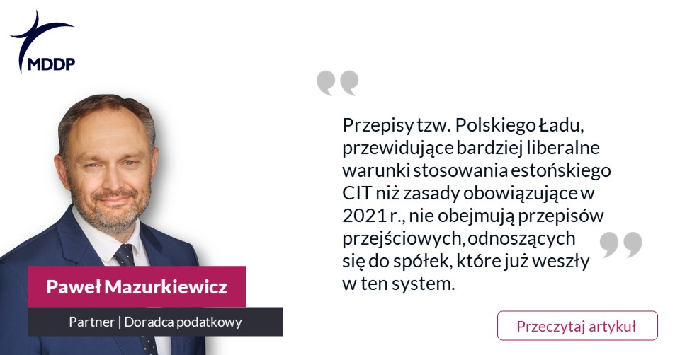 Przepisy tzw. Polskiego Ładu, przewidujące bardziej liberalne warunki stosowania estońskiego CIT niż zasady obowiązujące w 2021 r., nie obejmują przepisów przejściowych, odnoszących się do spółek, które już weszły w ten system. W takim przypadku, wynikająca z ordynacji podatkowej zasada in dubio pro tributario przemawia za stosowaniem nowych przepisów i w konsekwencji odstąpieniem od pobierania podatku „na wejściu”, należnego od tych spółek. Podatek ten byłby bowiem niewytłumaczalną sankcją dla tych nielicznych firm, które zdecydowały się skorzystać z opodatkowania „estońskiego” bezpośrednio po wejściu w życie nowych przepisów. Dla wyjaśnienia ewentualnych wątpliwości minister finansów mógłby również wydać interpretacje ogólną. Najlepiej jednak byłoby zapisać to rozwiązanie w nowelizacji ustawy, którą zresztą ministerstwo zapowiada w ramach poprawiania tzw. Polskiego Ładu.