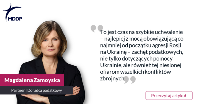 Nie każda pomoc dla Ukrainy wiąże się z zachętami podatkowymi. Wprost przeciwnie, niektóre działania mogą nieść za sobą wątpliwości. Chociaż podatki są jednym z ostatnich czynników motywujących pomoc, nie można ich nie brać pod uwagę, w szczególności jeżeli pomoc jest udzielana przez przedsiębiorcę, który musi wszystkie zdarzenia ująć w rozliczeniach podatkowych – pisze Magdalena Zamoyska, doradca podatkowy i partner w MDDP Michalik Dłuska Dziedzic i Partnerzy