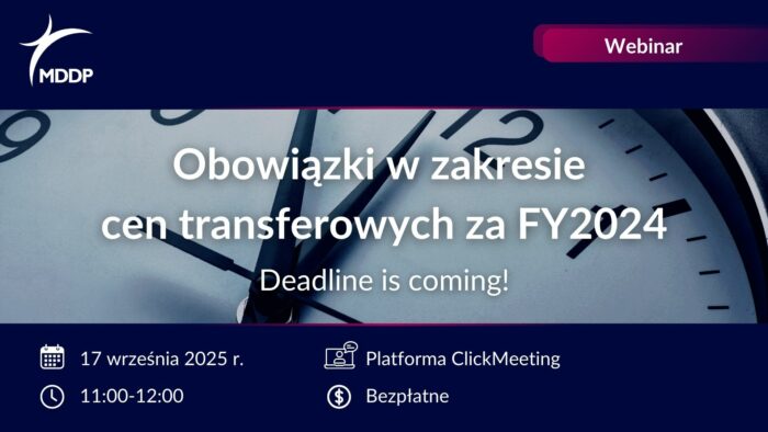 Podatek u źródła – aktualne trendy w świetle Objaśnień podatkowych MF z 3 lipca 2025 r. Już 28 sierpnia br. odbędzie się wydarzenie online dot. podatku u źródła, organizowane przez Krakowski Park Technologiczny i Polską Strefę Inwestycji, które poprowadzą eksperci MDDP – Justyna Bauta-Szostak, Katarzyna Kozakowska oraz Dariusz Fistek. Agenda wydarzenia: Zasady opodatkowania podatkiem u źródła wypłat za granicę (dywidendy, odsetki, należności licencyjne,…