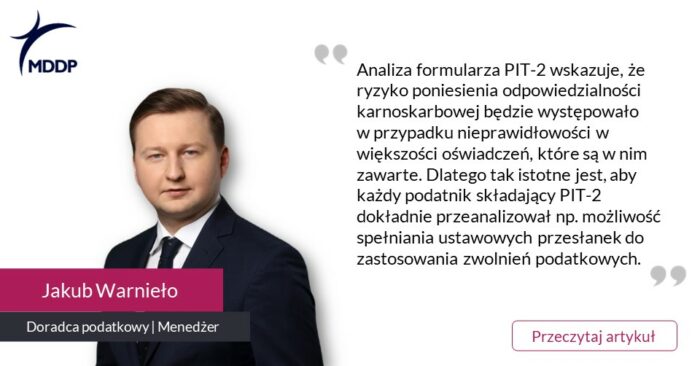 Za podanie nieprawdy w PIT-2 grożą sankcje zarówno karnoskarbowe, jak i karne Obowiązujący od początku 2023 r. wzór PIT-2 został znacznie rozbudowany w porównaniu z poprzednią wersją i obecnie obejmuje kilka wniosków i oświadczeń. Obok dotychczasowego pouczenia o odpowiedzialności karnoskarbowej w formularzu pojawiła się informacja o grożącej odpowiedzialności karnej. Podatnik składający formularz PIT-2 może podlegać dwóm odrębnym rodzajom odpowiedzialności związanej z przedstawieniem nieprawidłowych oświadczeń/wniosków dotyczących obliczania miesięcznych zaliczek…