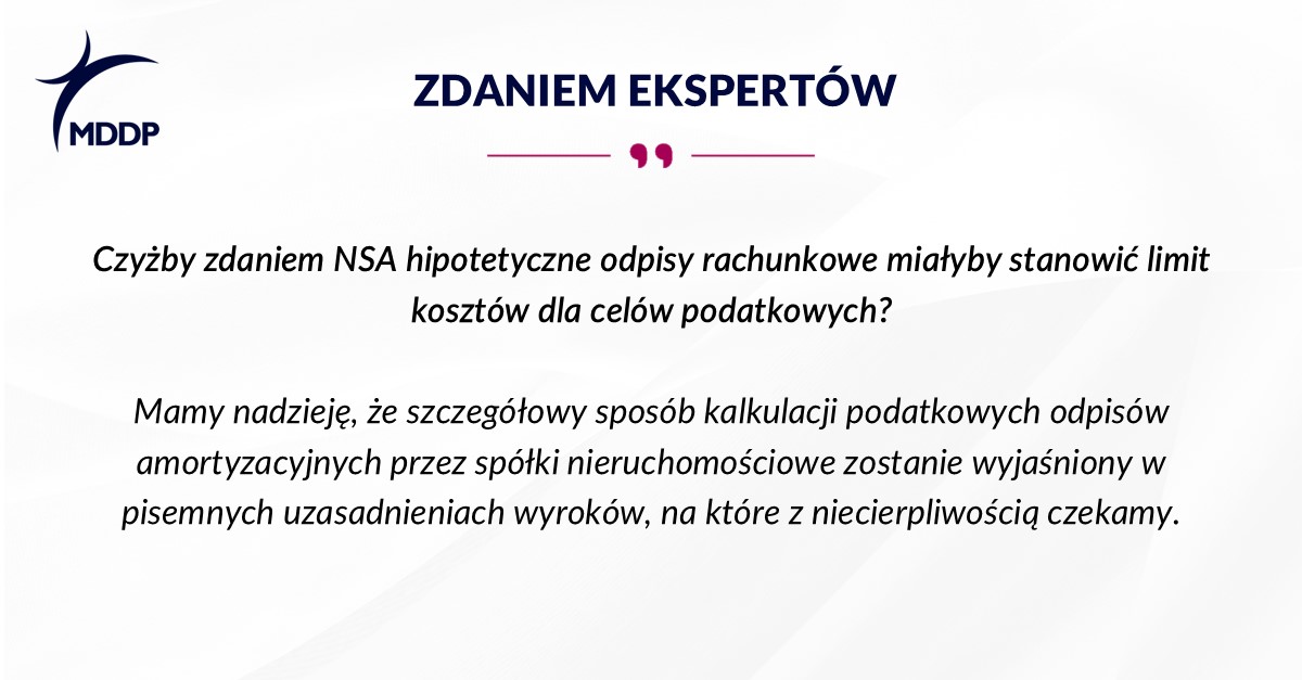 Trudno zatem zgodzić się z argumentacją organów podatkowych, że spółka nieruchomościowa, która nie dokonuje odpisów amortyzacyjnych na gruncie bilansowym, powinna stosować ograniczenie na gruncie podatkowym, skoro odpisy te nie obciążają jej wyniku finansowego”.
