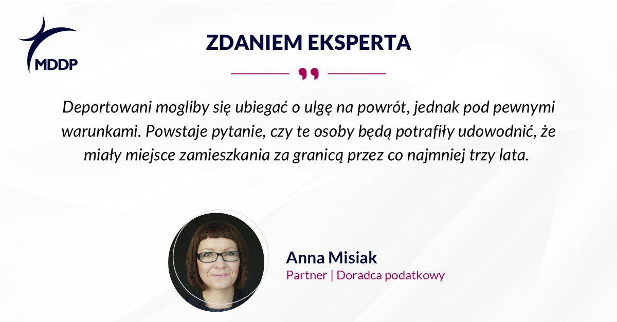 „Co do zasady, deportowani mogliby się ubiegać o ulgę, ale istnieją dwie zasadnicze kwestie. Po pierwsze, przy wyjeździe na dłużej za granicę, trzeba było zawiadomić o tym fakcie urząd skarbowy. Brak takiego zawiadomienia może utrudnić ustalenie, w którym momencie dana osoba przestaje być polskim rezydentem podatkowym”.