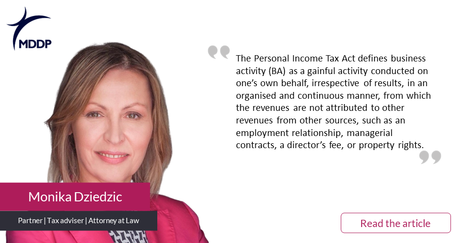 The Personal Income Tax Act defines business activity (BA) as a gainful activity conducted on one’s own behalf, irrespective of results, in an organised and continuous manner, from which the revenues are not attributed to other revenues from other sources, such as an employment relationship, managerial contracts, a director’s fee, or property rights.
