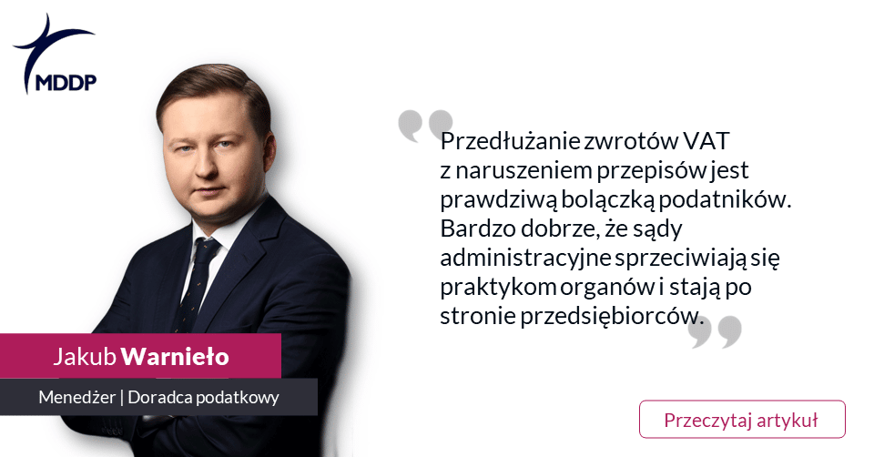 Jakub Warnieło, doradca podatkowy, menedżer w Zespole Postępowań Podatkowych MDDP: „Przedłużanie zwrotu VAT przez organy podatkowe z naruszeniem przepisów stanowi w ostatnim czasie prawdziwą bolączkę podatników. Dlatego bardzo dobrze, że sądy administracyjne coraz częściej badają prawidłowość działań fiskusa i stają po stronie podatników. Wyrok NSA przynosi bardzo cenne wskazówki dotyczące tego, w jaki sposób powinno być sporządzone uzasadnienie postanowienia o przedłużeniu zwrotu VAT. NSA sprzeciwił się automatyzmowi w wydawaniu przez organy podatkowe kolejnych postanowień o przedłużeniu zwrotów VAT – gdzie przed upływem terminu wskazanego w jednym postanowieniu wydawane jest kolejne rozstrzygnięcie o przedłużeniu i wskazana kolejna data końcowa przedłużenia. Sąd administracyjny bardzo celnie stwierdził, że w takim przypadku muszą zostać wykazane różnice w stosunku do wcześniejszych postanowień, skoro ustalany jest nim kolejny, dłuższy termin zwrotu. Wymaga to zatem szerszej i zarazem dostosowanej do kolejnego etapu czynności weryfikacyjnych argumentacji, a nie tylko automatycznego powielenia tego, co legło u podstaw skorzystania z omawianej tu instytucji prawnej. NSA słusznie zauważył, że w kolejnych postanowieniach konieczne jest zatem wskazanie zarówno konkretnych czynności weryfikacyjnych już podjętych, a także tych zaplanowanych oraz określenie potencjalnego czasu ich realizacji, które to elementy będą wyjaśniały przyjętą datę przedłużenia, która musi być konkretnie wskazana. W mojej ocenie – wyrok NSA należy ocenić pozytywnie. Praktyka organów podatkowych pokazuje, że postanowienia o przedłużeniu zwrotu VAT wystawiane są często w sposób automatyczny, bez spełnienia odpowiednich przesłanek określonych w przepisach. Tymczasem każde takie przedłużenie – w sytuacji ostatecznego potwierdzenia zasadności odliczenia VAT – to pozbawienie podatników możliwości dysponowania należnymi im środkami finansowymi, co może prowadzić do bardzo poważnych problemów w funkcjonowaniu firm. Dlatego też, zasadność każdego przedłużenia VAT powinna być odpowiednio przeanalizowana i uzasadniona przez organy podatkowe – co jednoznacznie potwierdził NSA.” Więcej w artykule w Dzienniku Rzeczpospolita: LINK