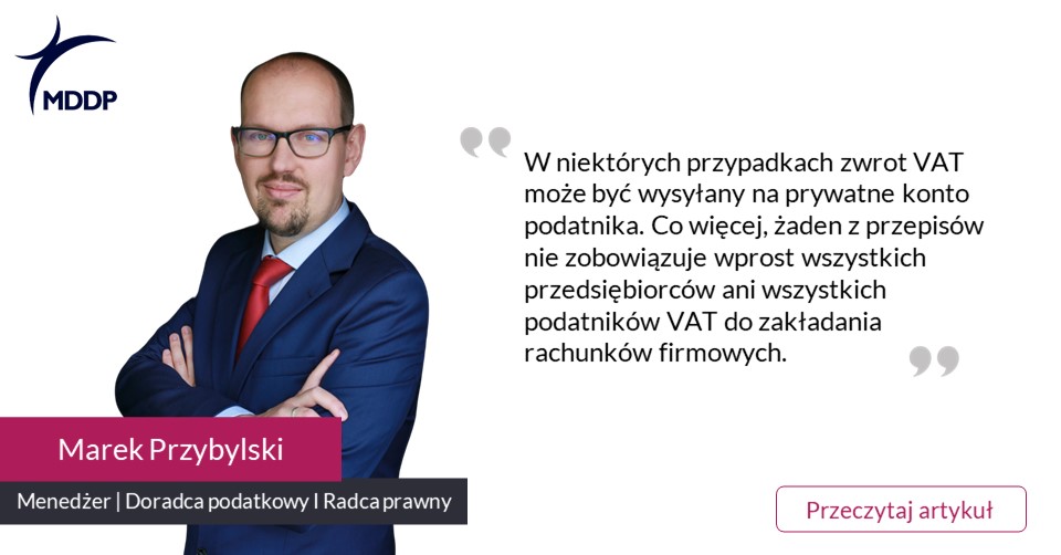 Nie zgadza się z tym Marek Przybylski, doradca podatkowy, radca prawny, menedżer w MDDP. Wskazuje, że w niektórych przypadkach zwrot VAT może być wysyłany na prywatne konto podatnika. Co więcej, żaden z przepisów nie zobowiązuje wprost wszystkich przedsiębiorców ani wszystkich podatników VAT do zakładania rachunków firmowych. Ekspert podkreśla, że jedynie art. 108e ustawy o VAT nakazuje założyć rachunek rozliczeniowy (tzw.firmowy) podatnikom dokonującym czynności podlegających pod regulacje o obowiązkowym mechanizmie podzielonej płatności.