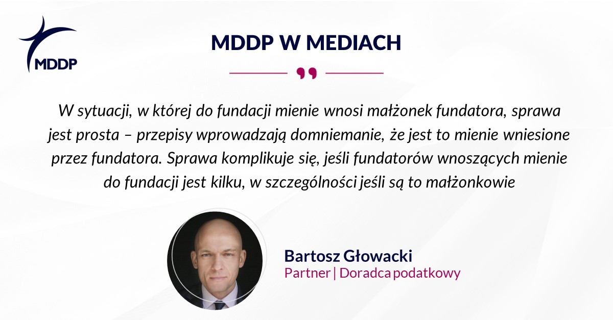 „Z jednej strony zatem ustawa wskazuje, że fundatorów może być kilku, ale na każdego z fundatorów nakazuje spojrzeć z osobna. Nie wiadomo jednak, jak to zrobić, ponieważ w żadnym momencie nie zostaje uchylone domniemanie, zgodnie z którym małżonek fundatora będący współfundatorem, dla celów proporcji jest traktowany jak ten pierwszy fundator. Można więc twierdzić, że dla celów liczenia proporcji fundator i współmałżonek fundatora są jedną osobą. Tyle że fiskus widzi to inaczej” – podkreśla Bartosz Głowacki.
