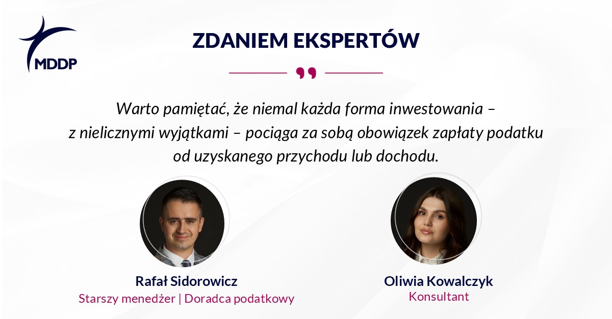 Zważywszy na to warto przyjrzeć się wybranym rodzajom inwestycji kapitałowych z perspektywy obowiązków podatkowych, jakie mogą spoczywać na inwestorach już przy rozliczeniach rocznych za 2024 r.