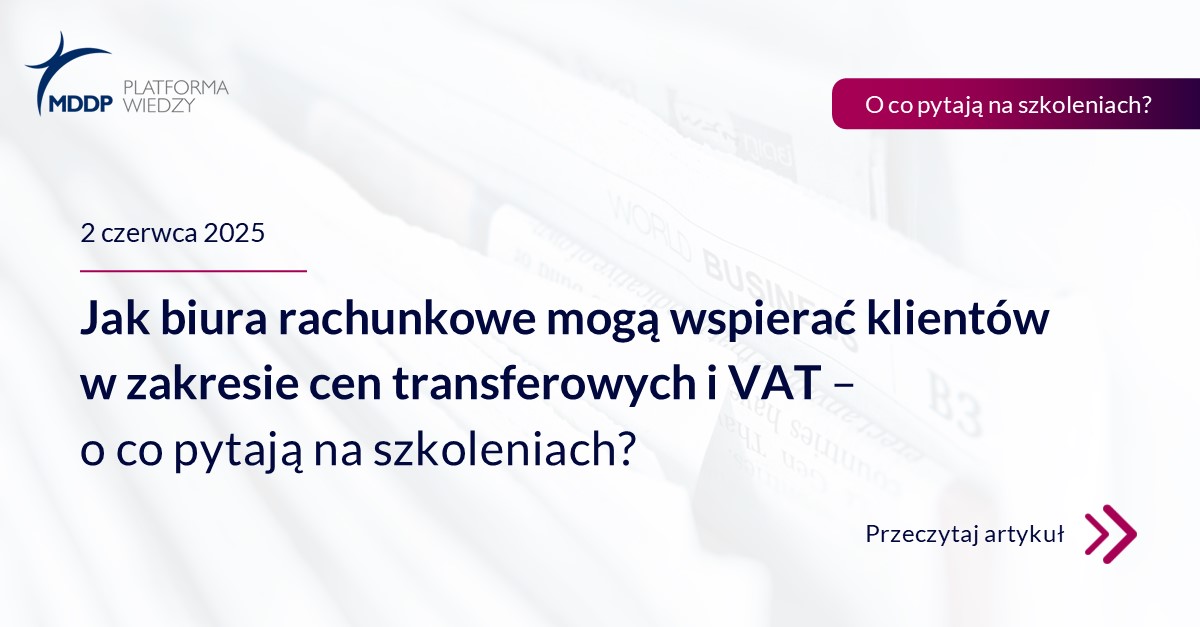 Zapraszamy do lektury artykułu autorstwa Magdaleny Marciniak, Marty Klepacz i dr. Pawła Selery, którzy podczas szkolenia organizowanego w ramach MDDP Platforma Wiedzy odpowiadali na wiele pytań i dzielili się praktycznymi wskazówkami i rekomendacjami dot. cen transferowych i VAT w kontekście pracy biur rachunkowych.