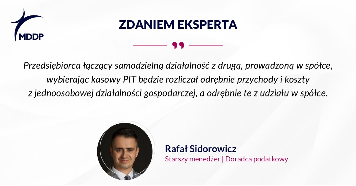 „To oznacza, że jeżeli przedsiębiorca łączący samodzielną działalność z drugą, prowadzoną w spółce, wybierze kasowy PIT, to będzie rozliczał odrębnie przychody i koszty z jednoosobowej działalności gospodarczej (na zasadzie kasowej), a odrębnie przychody i koszty z udziału w spółce (na zasadzie memoriałowej)”.