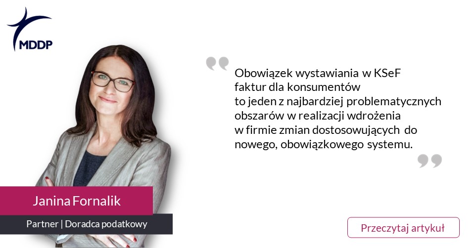 Janina Fornalik podkreśla, że: „Obowiązek wystawiania w KSeF faktur dla konsumentów to jeden z najbardziej problematycznych obszarów w realizacji wdrożenia w firmie zmian dostosowujących do nowego, obowiązkowego systemu.”