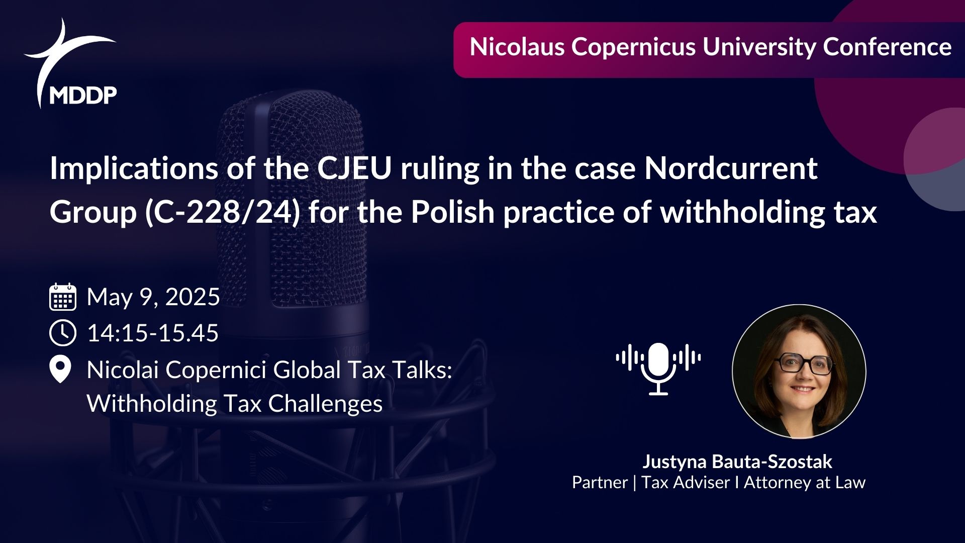We are pleased to announce that Justyna Bauta-Szostak, Partner, Tax Advisor, and Legal Counsel at MDDP, will participate in the 1st Nicolai Copernici Global Tax Talks: Withholding Tax Challenges conference. This prestigious event will take place on May 9–10, 2025, at the Faculty of Law and Administration, Nicolaus Copernicus University in Toruń, Poland.