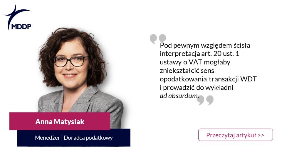 Pod pewnym względem ścisła interpretacja art. 20 ust. 1 ustawy o VAT mogłaby zniekształcić sens opodatkowania transakcji WDT i prowadzić do wykładni ad absurdum. Zgodnie bowiem z generalną zasadą wprowadzoną w art. 13 ust. 1 ustawy o VAT, aby doszło do WDT, muszą być spełnione następujące przesłanki: