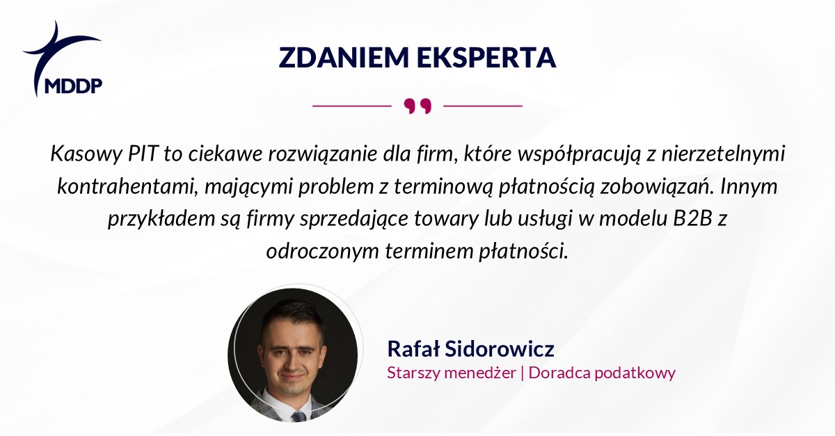Rafał Sidorowicz, starszy menedżer, doradca podatkowy w zespole podatków osobistych i doradztwa dla pracodawców MDDP, podkreśla, że nie można jednoznacznie ocenić, czy warto stosować kasowy PIT. Wszystko zależy bowiem od indywidualnych okoliczności: