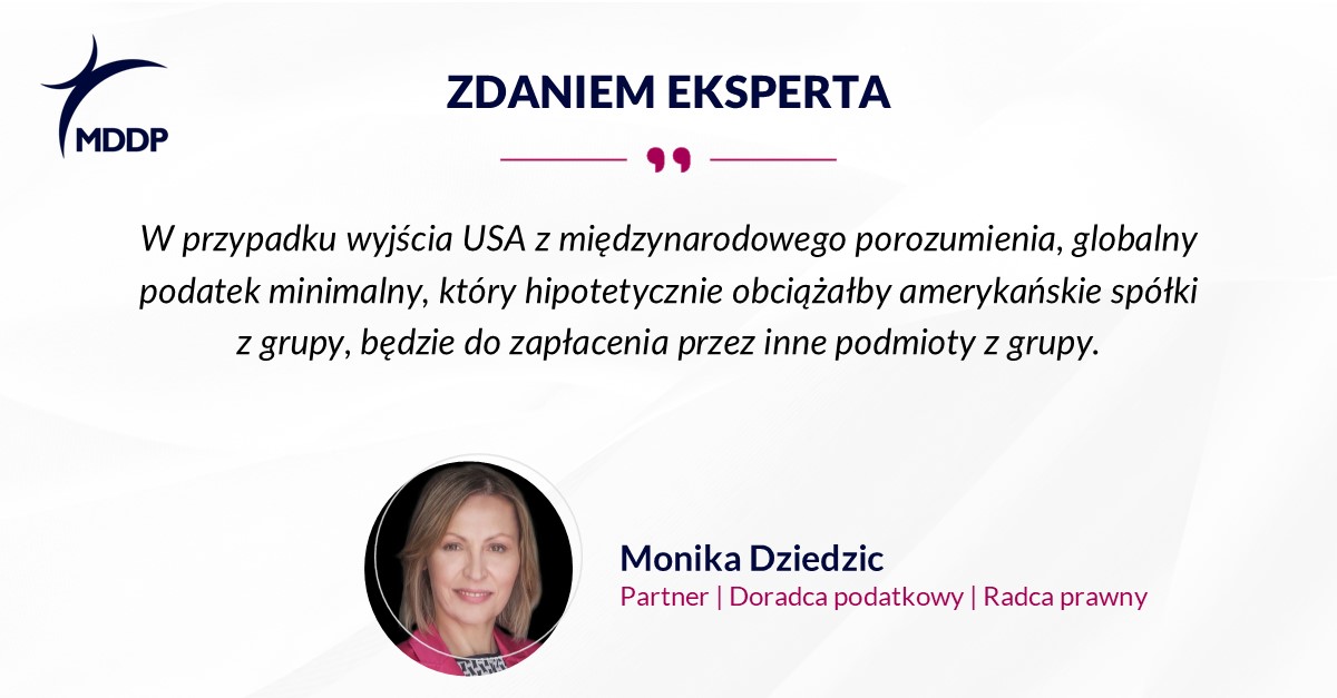 W Polsce ustawa o GloBE już obowiązuje, dlatego na polskich firmach wchodzących w skład dużych grup kapitałowych spoczywa obowiązek zapłacenia tej daniny. Jak podkreśla Monika Dziedzic, partner, doradca podatkowy, radca prawny w MDDP, z indywidualnych wyliczeń może się okazać, że jeśli w danej grupie kapitałowej są podmioty z USA, to wyjście tego kraju z porozumienia nie wpłynie na konieczność opodatkowania w Polsce: