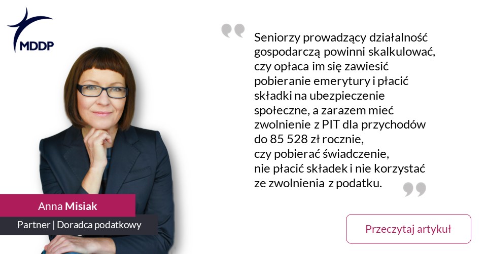 Anna Misiak, doradca podatkowy, partner w firmie MDDP, zauważa: „Seniorzy powinni więc skalkulować, czy opłaca im się zawiesić pobieranie emerytury i płacić składki na ubezpieczenie społeczne, a zarazem mieć zwolnienie z PIT dla przychodów do 85 528 zł rocznie, czy pobierać świadczenie, nie płacić składek i nie korzystać ze zwolnienia z podatku”.