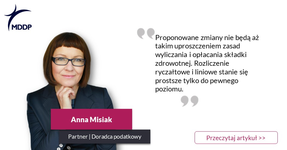 Proponowane zmiany nie będą aż takim uproszczeniem zasad wyliczania i opłacania składki zdrowotnej. Rozliczenie ryczałtowe i liniowe stanie się prostsze tylko do pewnego poziomu, wynoszącego przy podatku liniowym ok. 16 tys. zł i przy ryczałcie ok. 32 tys. zł. Po przekroczeniu tych progów przedsiębiorca zapłaci od nadwyżki składkę procentową. A to oznacza, że będzie musiał obliczyć dochód lub przychód na potrzeby wyliczenia tej składki. Powstaje też pytanie, czy ta nadwyżka będzie rozliczana miesięcznie czy może rocznie. Dopóki nie ma projektu przepisów, trudno odpowiedzieć na to pytanie i potwierdzić, czy nowe rozwiązania będą mniej uciążliwe i bardziej przewidywalne – podkreśla Anna Misiak, partner, doradca podatkowy w MDDP.
