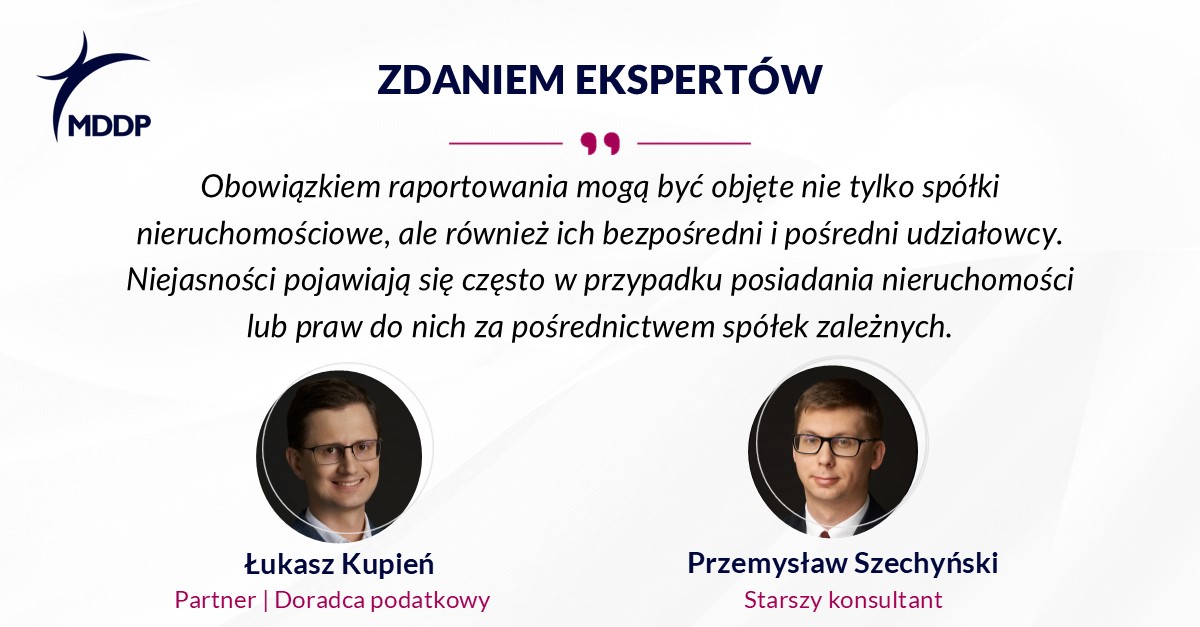 – Rekomendujemy uwzględnienie nowej wykładni przyjmowanej przez organy podatkowe przy weryfikacji obowiązków raportowania oraz weryfikację zakresu podmiotów raportowanych w latach wcześniejszych. Obowiązkiem raportowania mogą być objęte nie tylko spółki nieruchomościowe, ale również ich bezpośredni i pośredni udziałowcy. – dodaje Przemysław Szechyński, starszy konsultant w zespole nieruchomości MDDP.