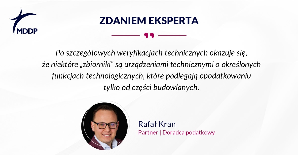 Problem dotyczy też zbiorników. Okazuje się, że obiekty zwyczajowo nazywane zbiornikami pełnią różne funkcje, nie zawsze magazynową, czyli tę, o której mowa w przepisach. Po szczegółowych weryfikacjach technicznych okazuje się, że niektóre „zbiorniki” są urządzeniami technicznymi o określonych funkcjach technologicznych, które podlegają opodatkowaniu tylko od części budowlanych” – podkreśla Rafał Kran.