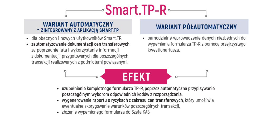- Zautomatyzowanie i przyspieszenie procesu wypełniania, a następnie złożenia formularza TP-R. Możliwość zintegrowania z aplikacją Smart.TP służącą do automatycznego generowania dokumentacji cen transferowych.