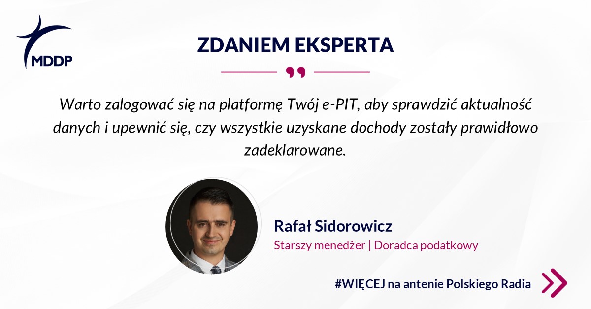 „Warto zalogować się na platformę Twój e-PIT, aby sprawdzić aktualność danych i upewnić się, czy wszystkie uzyskane dochody zostały prawidłowo zadeklarowane.
