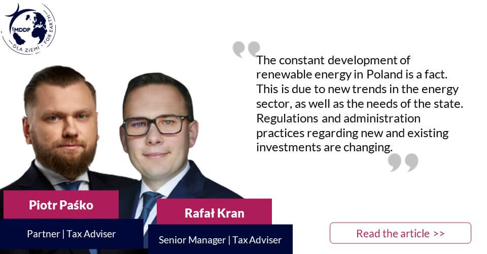 The constant development of renewable energy in Poland is a fact. This is due to new trends in the energy sector, as well as the needs of the state. Regulations and administration practices regarding new and existing investments are changing. This requires investors to have a good understanding of the legal area, which also affects economic projections. It is worth paying attention to tax issues, because they often determine the decision to start an investment and its form.