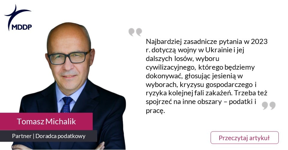 Najbardziej zasadnicze pytania dotyczą wojny w Ukrainie i jej dalszych losów, wyboru cywilizacyjnego, którego będziemy dokonywać, głosując jesienią w wyborach, kryzysu gospodarczego i ryzyka kolejnej fali zakażeń. Już trochę zapomnieliśmy o COVID-19, ale nie mamy pewności, czy on zapomniał o nas. Trzeba też spojrzeć na inne obszary – podatki i pracę – pisze Tomasz Michalik, partner w MDDP Michalik Dłuska Dziedzic i Partnerzy na łamach Business Insider.
