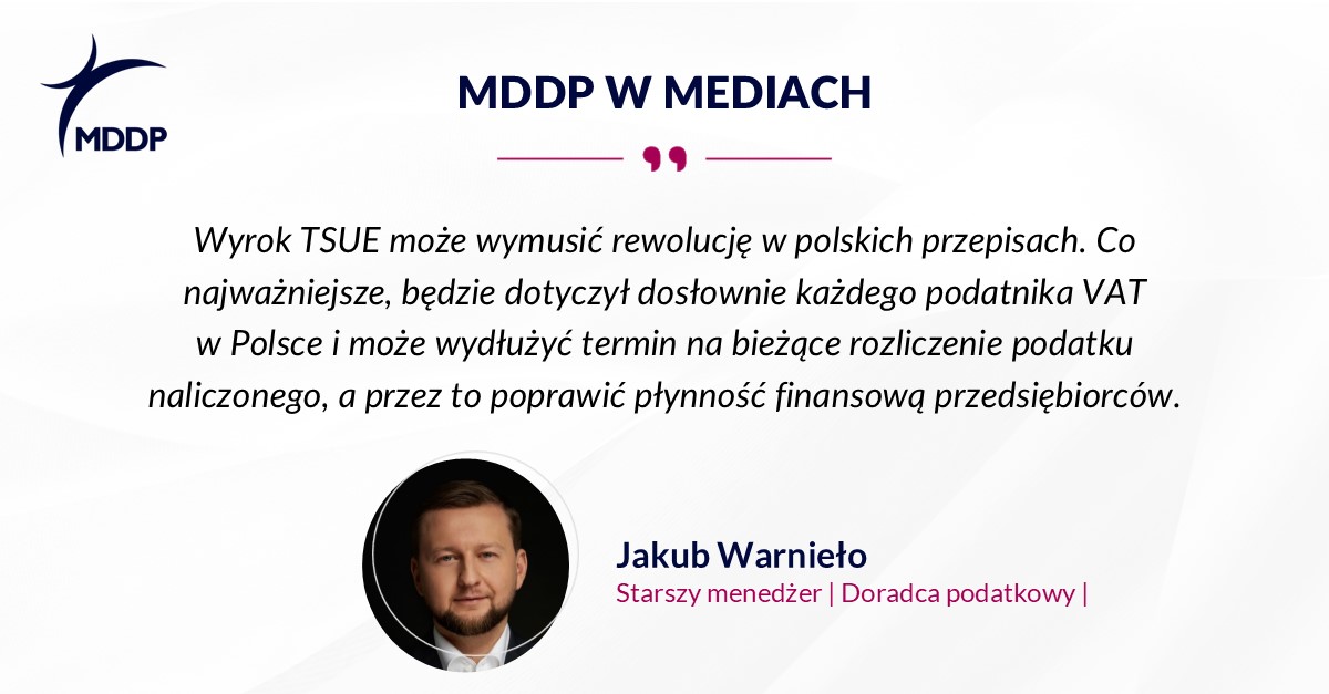 Wyrok europejskiego trybunału może mieć niebagatelne znaczenie na wielu płaszczyznach. Może on wymusić rewolucję w polskich przepisach i całkowicie przewrócić postrzeganie faktury jako podstawy istnienia prawa do odliczenia. A co najważniejsze, będzie dotyczył dosłownie każdego podatnika VAT w Polsce i może wydłużyć termin na bieżące rozliczenie podatku naliczonego, a przez to poprawić płynność finansową przedsiębiorców” – mówi Jakub Warnieło.
