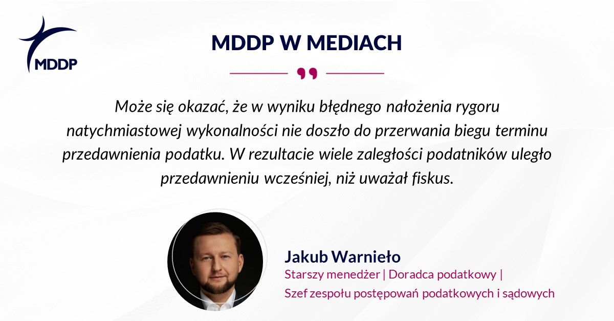 Może się okazać, że w wyniku błędnego nałożenia rygoru natychmiastowej wykonalności nie doszło do przerwania biegu terminu przedawnienia podatku. W rezultacie wiele zaległości podatników uległo przedawnieniu wcześniej, niż uważał fiskus.