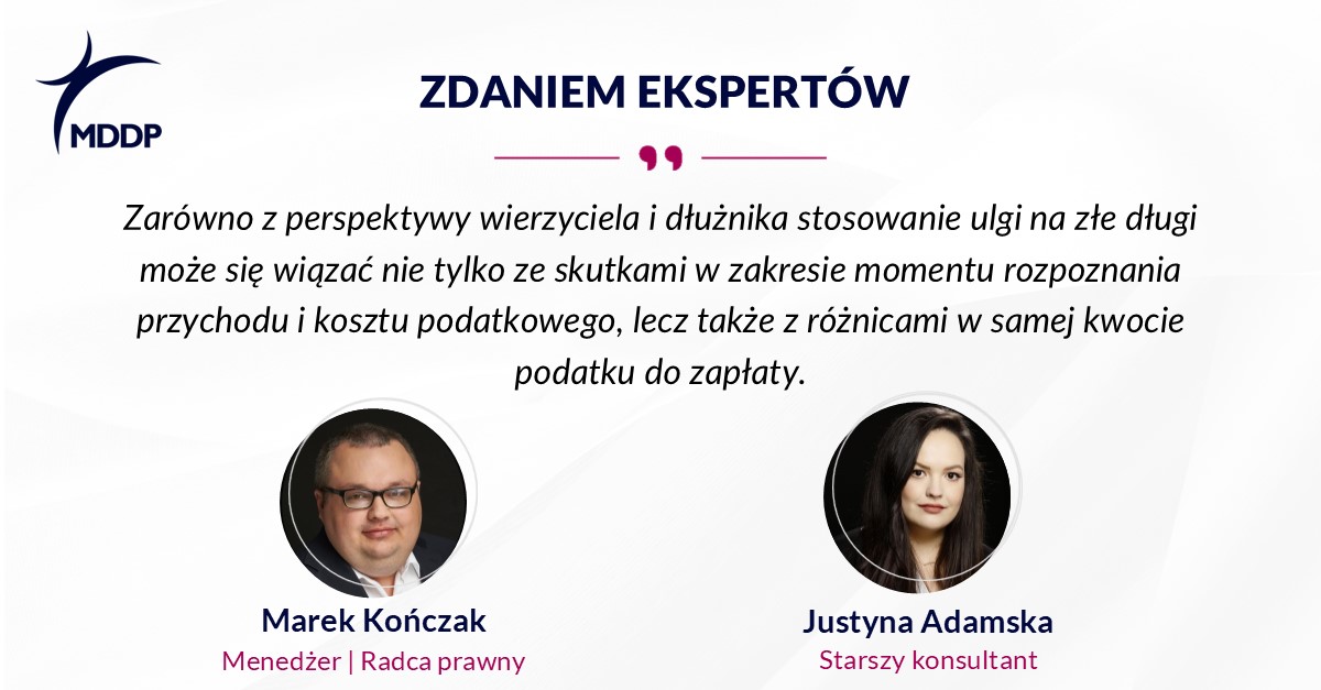 Marek KończakJustyna Adamska, eksperci MDDP, podkreślają, że w tej kwestii nie ma utrwalonej praktyki organów podatkowych, ale powyższe podejście było przez nie akceptowane. Autorzy artykułu na podstawie przykładów wyjaśniają pozytywny i negatywny wpływ ulgi na złe długi: