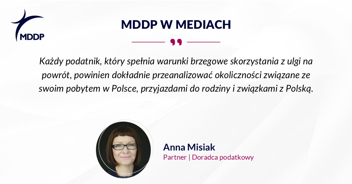 „Każdy podatnik, który spełnia warunki brzegowe skorzystania z ulgi na powrót, powinien dokładnie przeanalizować okoliczności związane ze swoim pobytem w Polsce, przyjazdami do rodziny, związkami z Polską przed przeniesieniem swojego centrum interesów życiowych do naszego kraju”.