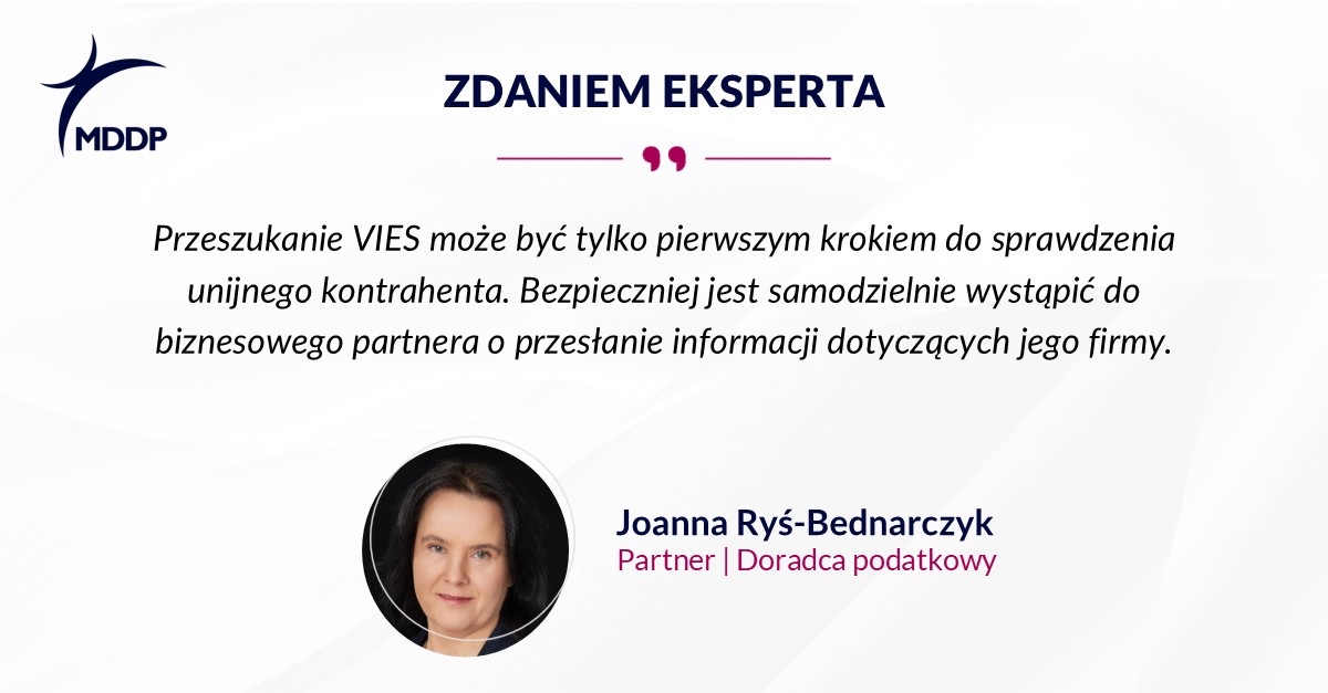 „Przeszukanie VIES może być tylko pierwszym krokiem do sprawdzenia unijnego kontrahenta, ale nie powinien to być krok jedyny. Bezpieczniej jest samodzielnie wystąpić do biznesowego partnera o przesłanie informacji dotyczących jego firmy, wyciągu z jego krajowego systemu, np. o nadanym numerze dla transakcji lokalnych, a przede wszystkim wewnątrzwspólnotowych”.