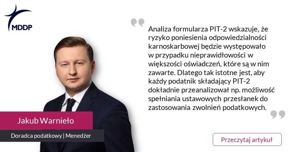 Podatnik składający formularz PIT-2 może podlegać dwóm odrębnym rodzajom odpowiedzialności związanej z przedstawieniem nieprawidłowych oświadczeń/wniosków dotyczących obliczania miesięcznych zaliczek na PIT, czyli odpowiedzialności karnej skarbowej oraz odpowiedzialności karnej.