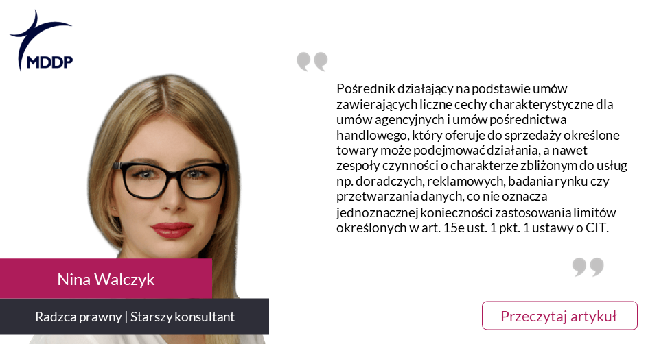 Pośrednik działający na podstawie umów zawierających liczne cechy charakterystyczne dla umów agencyjnych i umów pośrednictwa handlowego, który oferuje do sprzedaży określone towary może podejmować działania, a nawet zespoły czynności o charakterze zbliżonym do usług np. doradczych, reklamowych, badania rynku czy przetwarzania danych, co nie oznacza jednoznacznej konieczności zastosowania limitów określonych w art. 15e ust. 1 pkt. 1 ustawy o CIT.