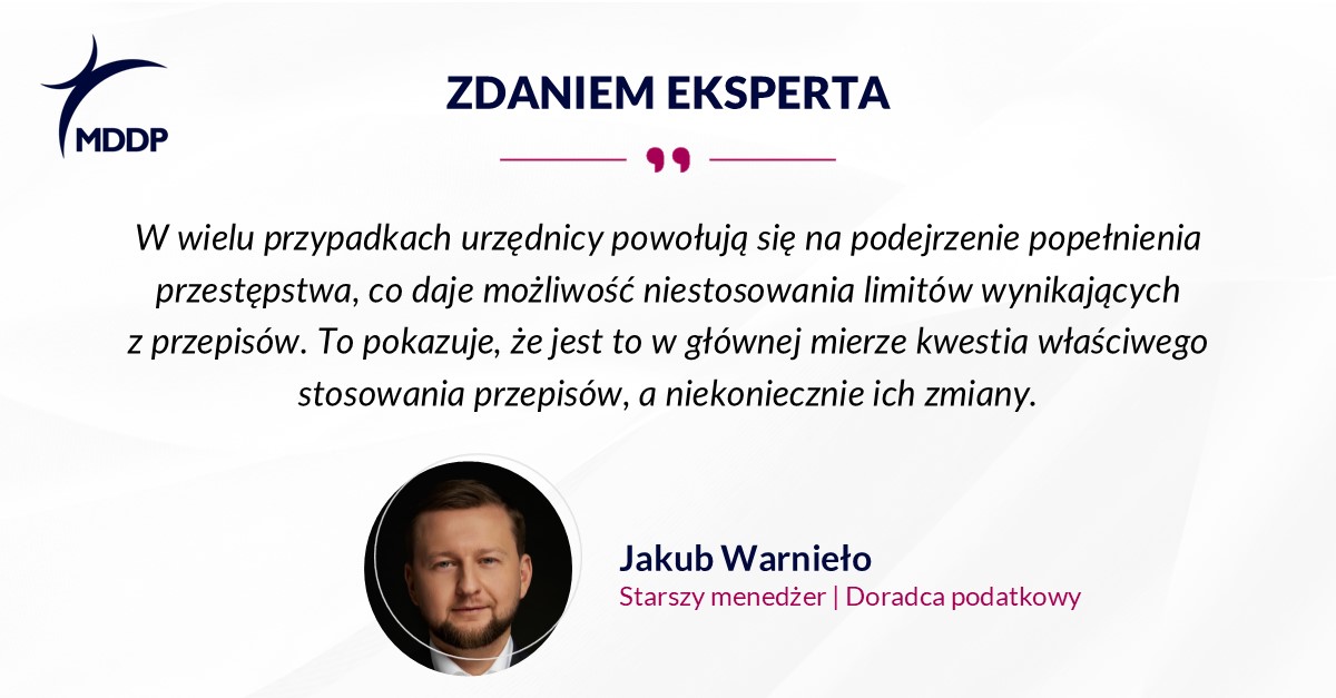 „Przepisy przewidują także maksymalne okresy trwania kontroli. Wydaje się zatem, że problemem nie są w tym przypadku same przepisy, ale ich stosowanie przez organy podatkowe. Wielokrotnie zdarzało się kontrolującym nadużywanie przepisów o dopuszczalnych terminach kontroli. W wielu przypadkach urzędnicy powołują się też na podejrzenie popełnienia przestępstwa, co daje im możliwość niestosowania limitów wynikających z przepisów. To pokazuje, że to w głównej mierze kwestia właściwego stosowania przepisów, a niekoniecznie ich zmiany” – podkreśla nasz ekspert.