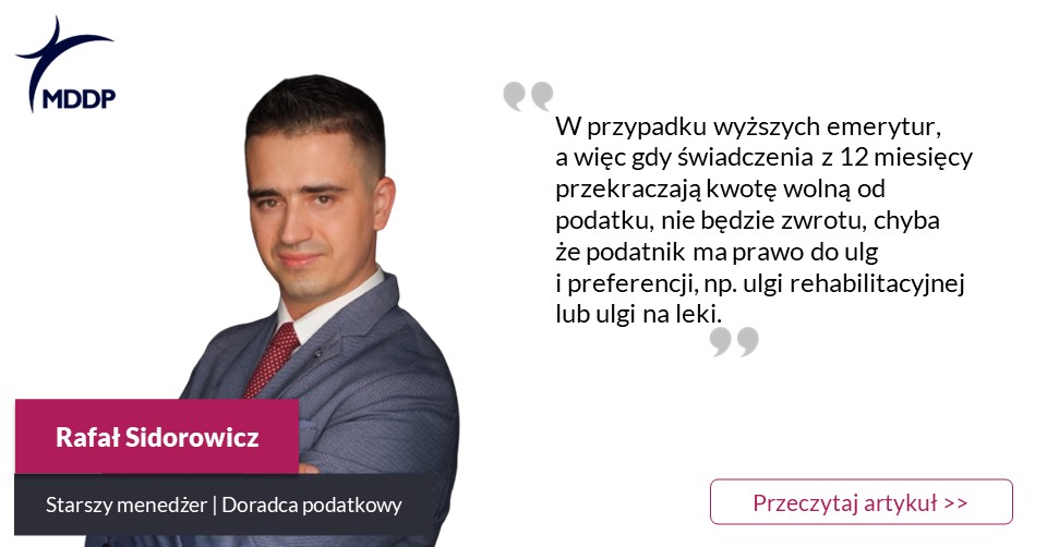 W przypadku wyższych emerytur, a więc gdy świadczenia z 12 miesięcy przekraczają kwotę wolną od podatku, nie będzie zwrotu, chyba że podatnik ma prawo do ulg i preferencji (spełnił warunki), np. ulgi rehabilitacyjnej lub ulgi na leki — wyjaśnia nasz ekspert
